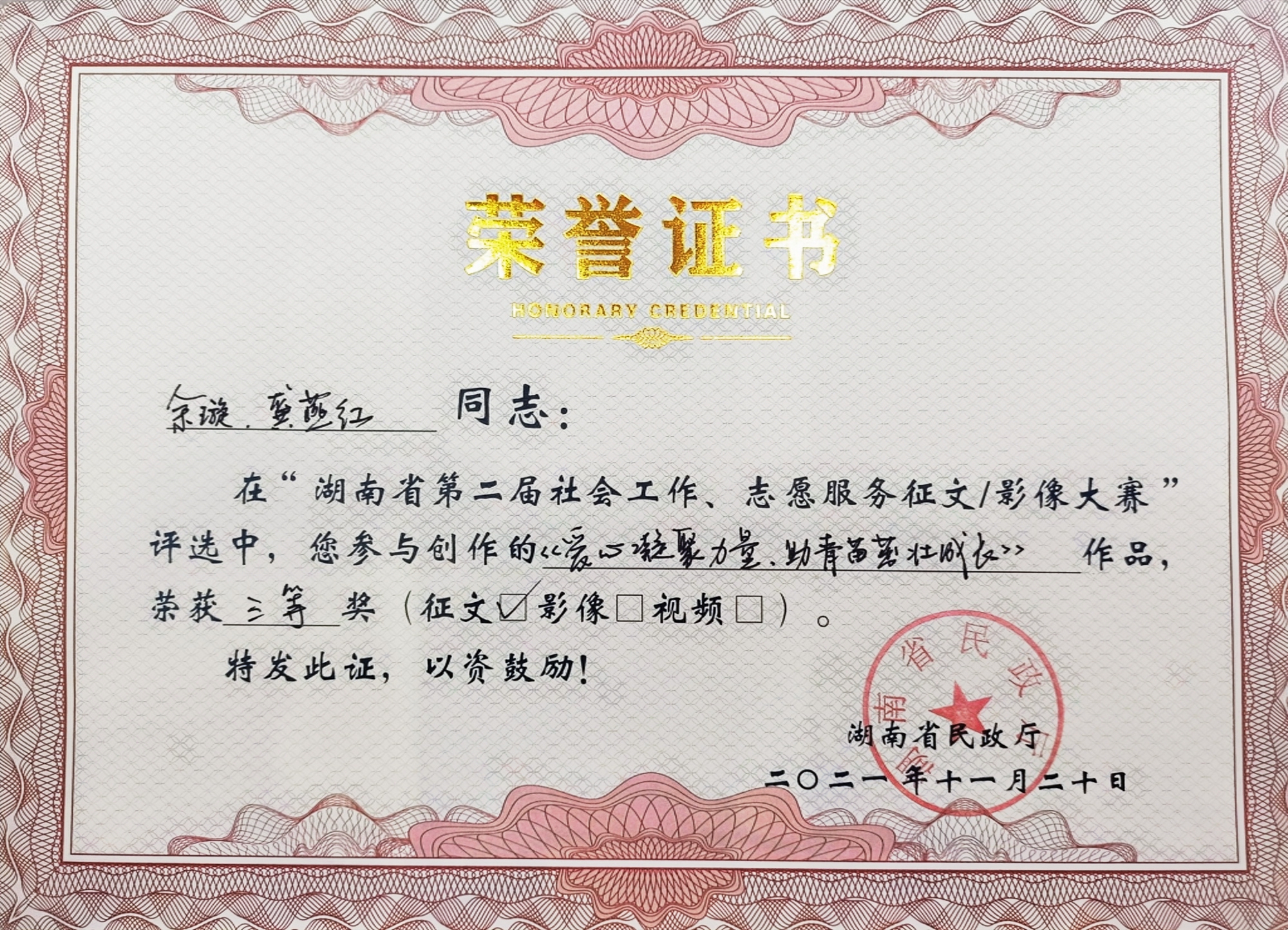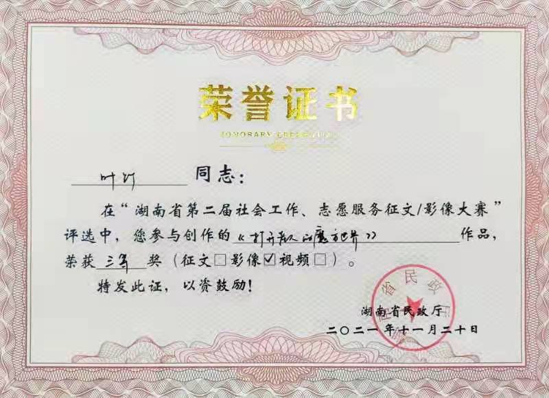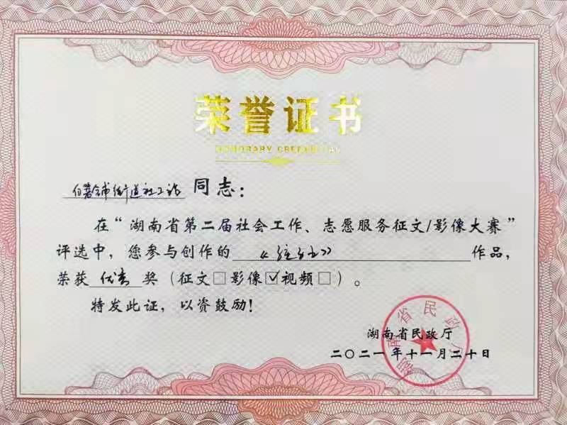 2021年,我司多名員工積極踴躍投稿參與由湖南省民政廳主辦、湖南公共頻道承辦的湖南省第二屆社會工作、志愿服務征文暨影像大賽。他們講述平凡而偉大的故事,展現社會工作者精神風貌,傳播真善美,弘揚正能量。其中兩篇原創征文作品、三幅原創影像作品在比賽中脫穎而出,榮獲一等獎1個、三等獎3個、優秀獎1個。